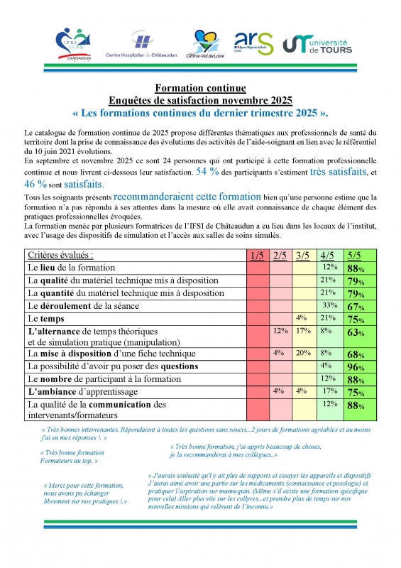Pour obtenir des éléments plus précis sur la satisfaction des formations continues, merci de nous solliciter par courriel à l’adresse : ifsi@ch-chateaudun.fr